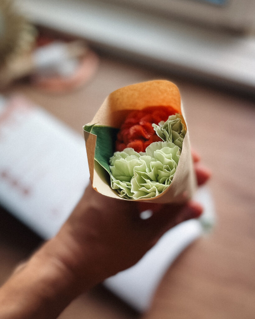 カーネーションも赤系ではなく、白系の薄い緑でとてもかわいい。真っ赤じゃないところがおしゃれだなーと思いました。
